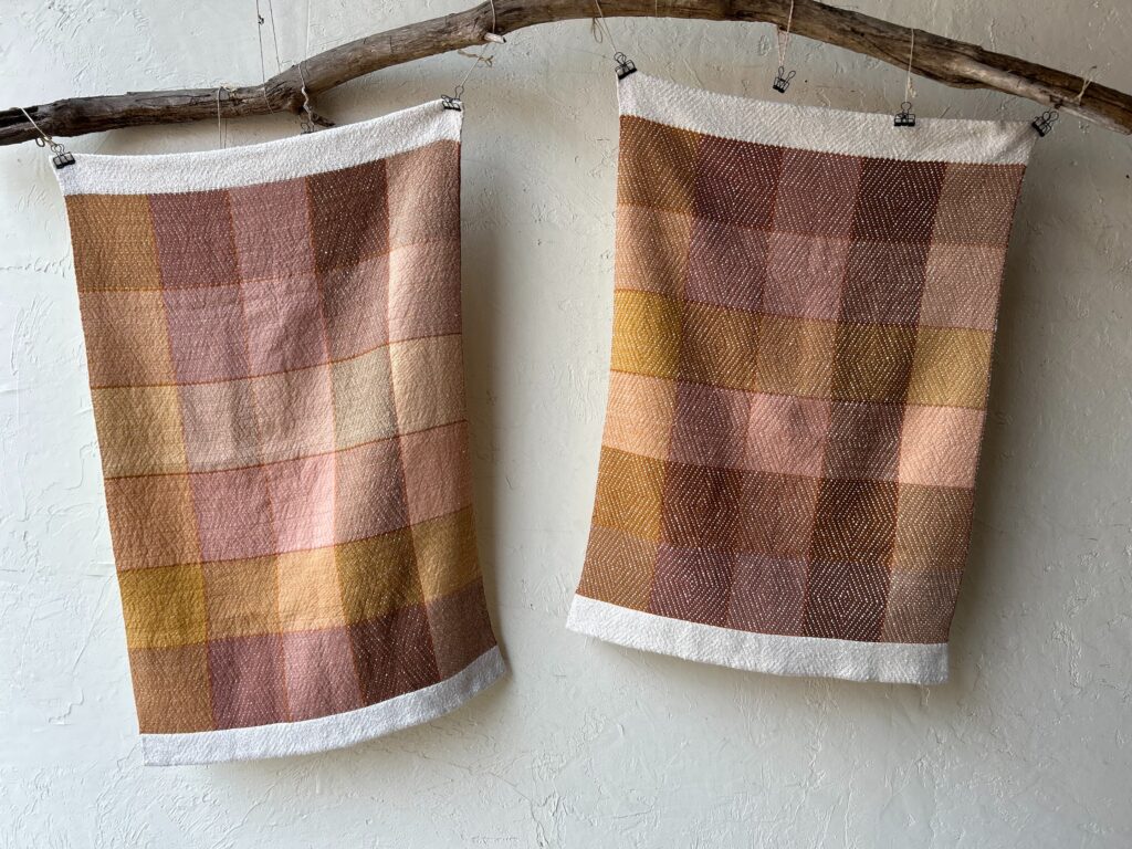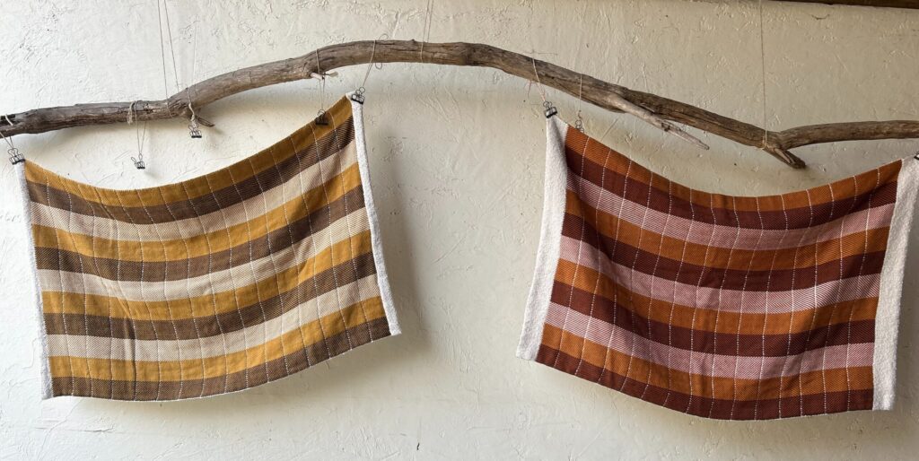 For the final warp, I wove a version in which I placed the stitchers every 8th & 9th pick (first pic) which I think was a perfect interval, but that was a real “pat your head/rub your stomach” treadling sequence in which the stitchers didn’t fall at the same place in the thick treadling sequence,