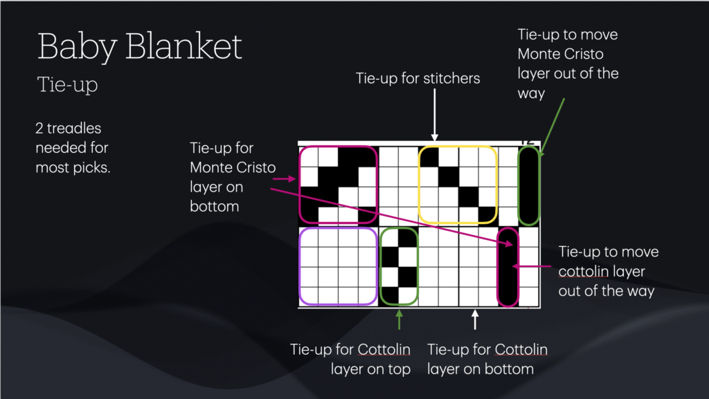 I have woven a lot of double weave, but didn’t want the firmness that comes with a lot of block double weaves. I loved the texture of the few things that I had woven in stitched double cloth, and knew that for a baby blanket, I didn’t want to stuff the layers (often called matelassé) or have a one-sided blanket (true of a lot of piqué). So I went the stitched double cloth route, and started drafting with the help of my friends: